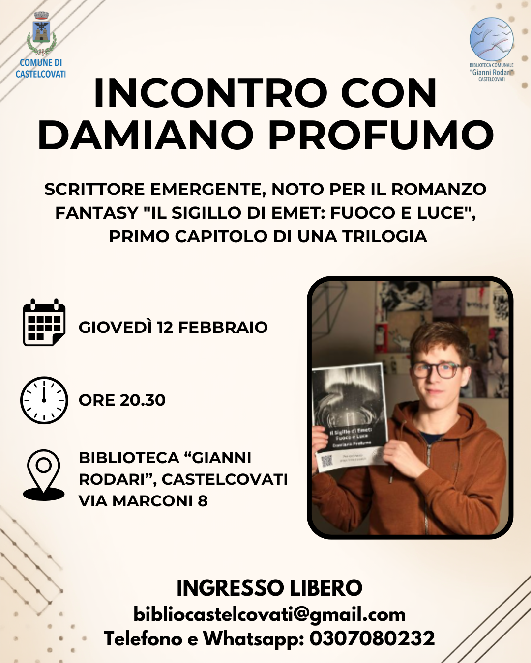Il Comune di Castelcovati e la Biblioteca "G. Rodari" vi invitano all' incontro con Damiano Profumo, scrittore emergente noto per il fantasy "Il sigillo di Emet fuoco e luce" , Giovedì 12 Febbraio 2026 alle ore 20:30.